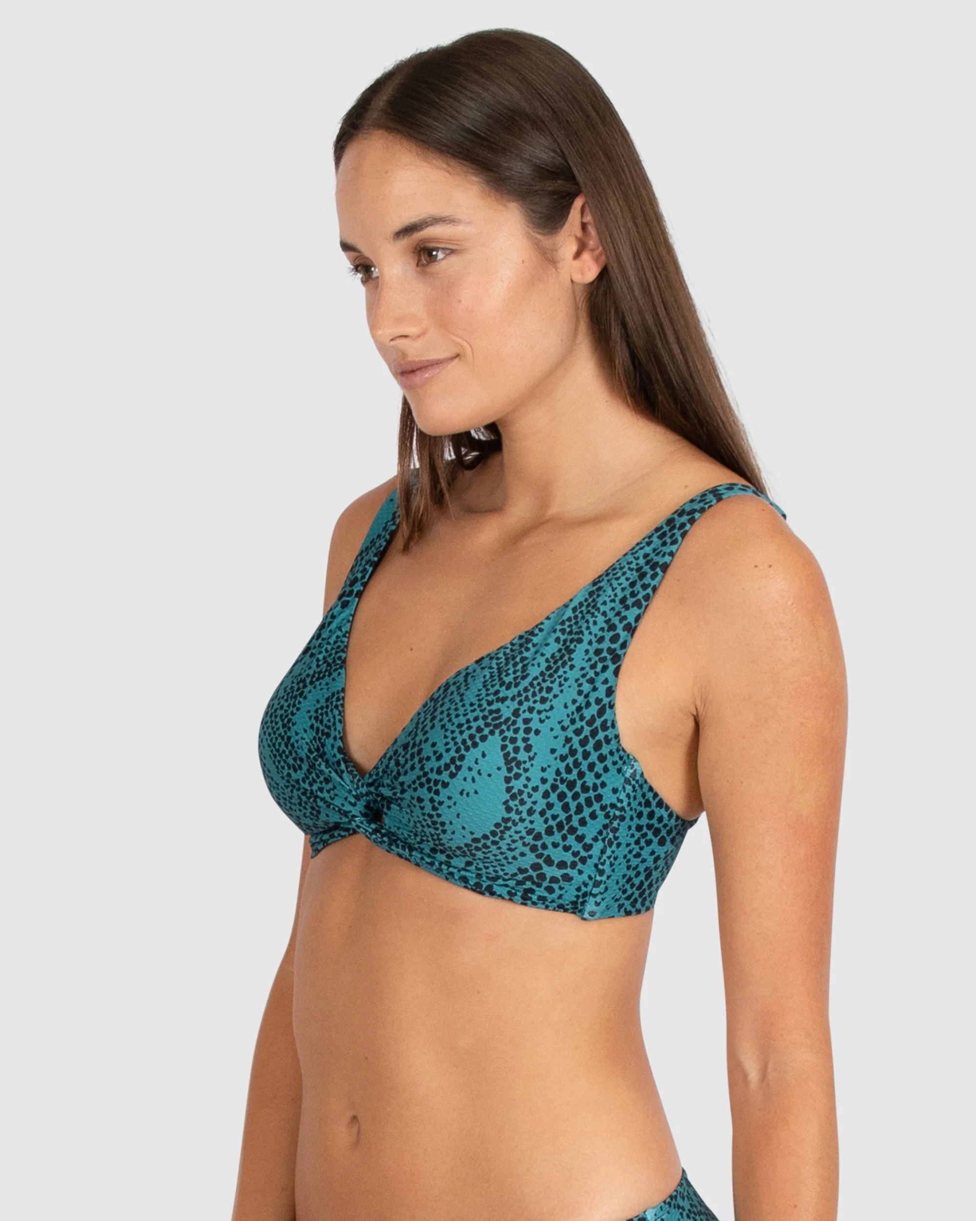 Baku's Everglades D/DD Twist Bralette Bikini Top features a flattering dropped neckline with a twist centre front detail. It has power mesh stability and side boning for added support with removable soft cups. It also features adjustable straps and fastens with a clip back. Follow us into a world of wilderness and wonder and get in touch with your animal instincts with Everglades. Animal print continues to dominate with snakeskin sliding into focus. Deep rich tones make up this interesting scale texture.