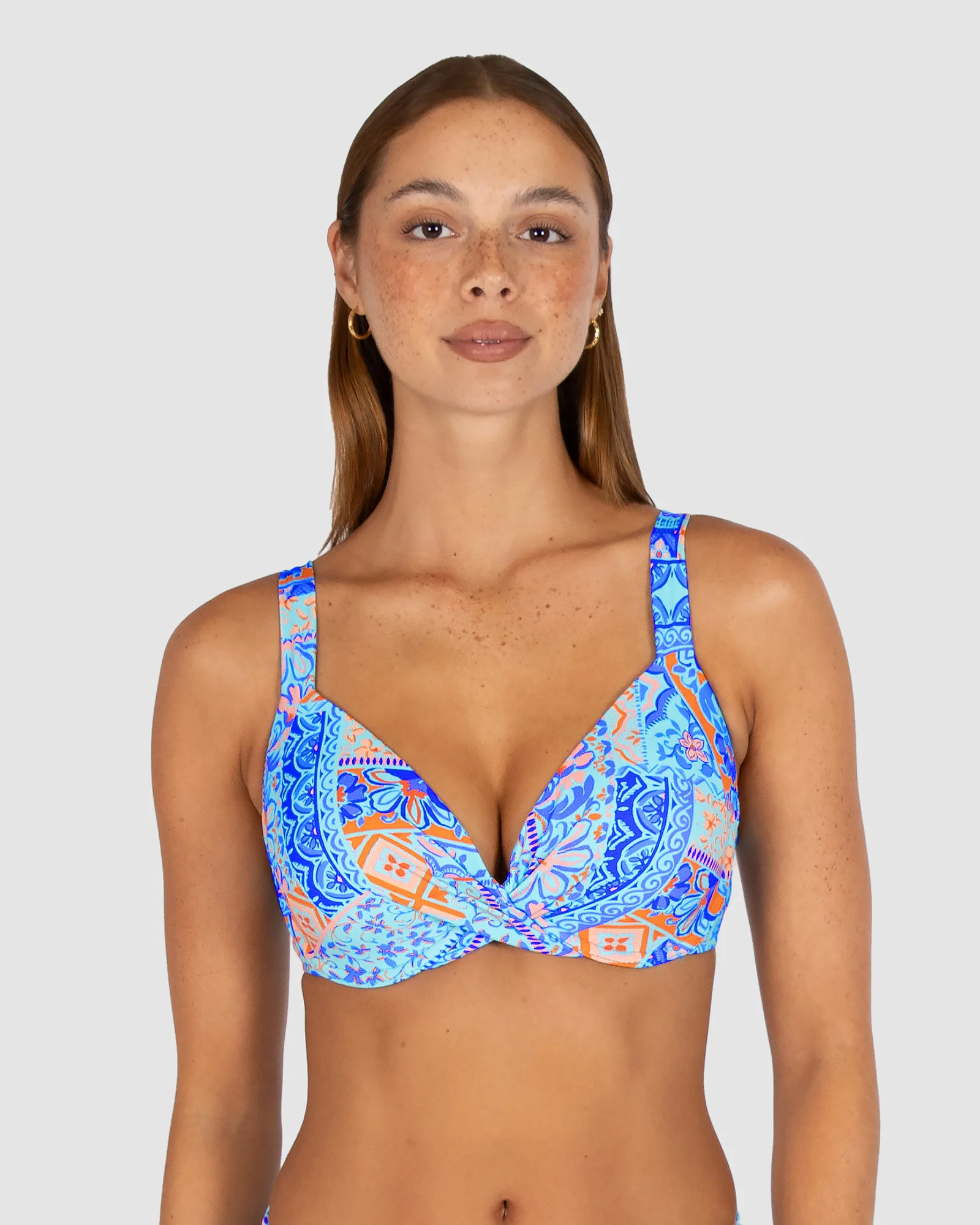 Baku's Tulum D-DD Cup Moulded Bikini Bra Top features a flattering draped twist at the front. It also features moulded underwire cups, adjustable and convertible straps and fastens with a clip back.
